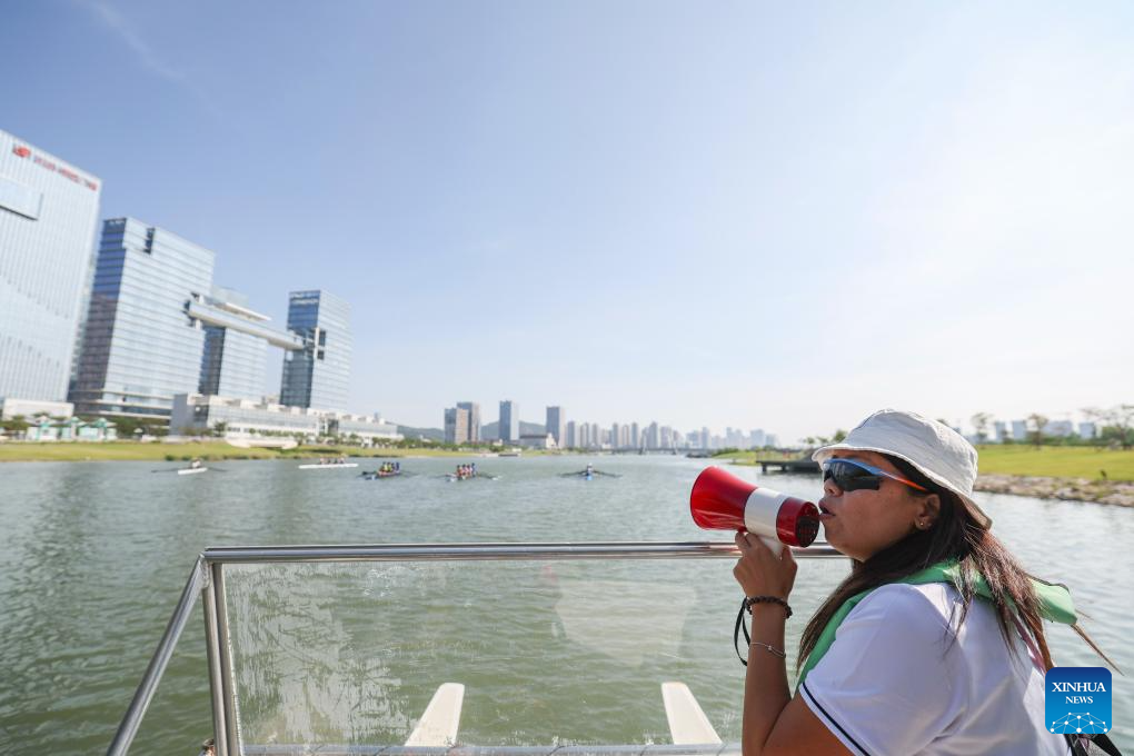 Trainees exercise rowing on the Tianmu River in Hengqin, south China's Guangdong Province, June 21, 2025. (Xinhua/Mao Siqian)