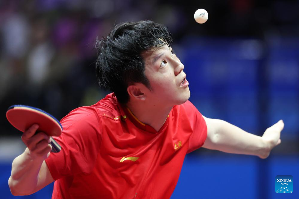 Fan Zhendong of Shanghai serves in the match against Liang Jingkun of Hebei during the men's team quarterfinal match of table tennis between Shanghai and Hebei at China's 15th National Games in Macao, south China, Nov. 18, 2025. (Xinhua/Liu Xu)