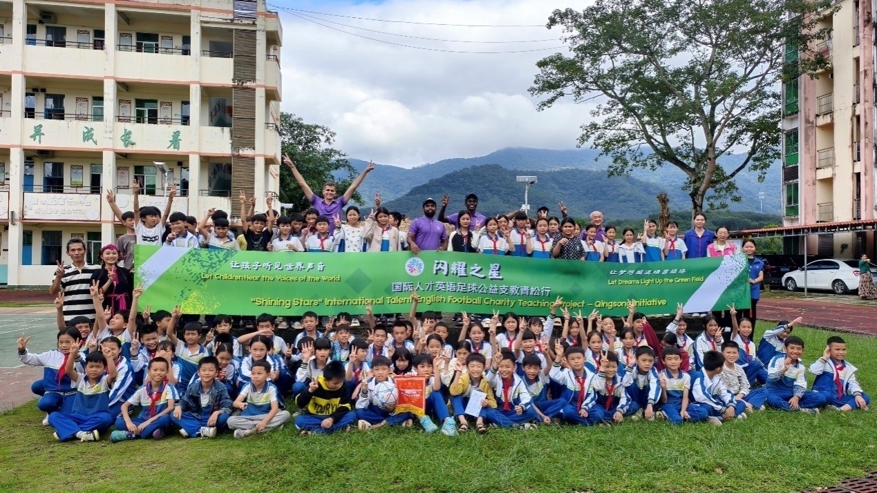 Members of Haikou International Talent Community and the Haikou International Talent Volunteer Service Team host an English teaching program and a football training program for local students in Qingsong township, Baisha Li Autonomous County, south China's Hainan Province, October 2025. (Photo courtesy of Haikou International Talent Community)