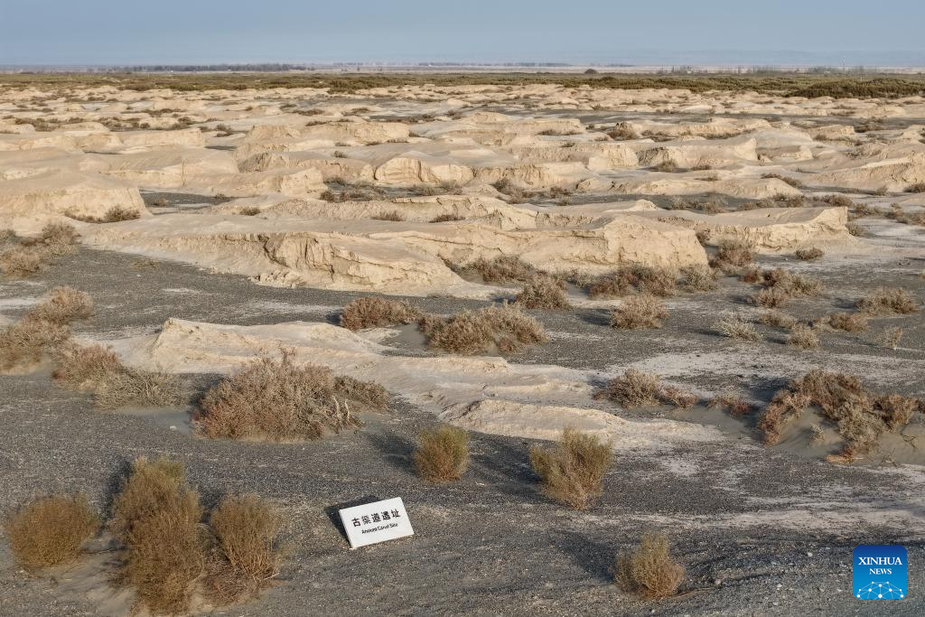 A drone photo taken on Nov. 18, 2025 shows the site of an ancient canal of an irrigation canal system in Guazhou County, Jiuquan City, northwest China's Gansu Province. (Xinhua/Lang Bingbing)