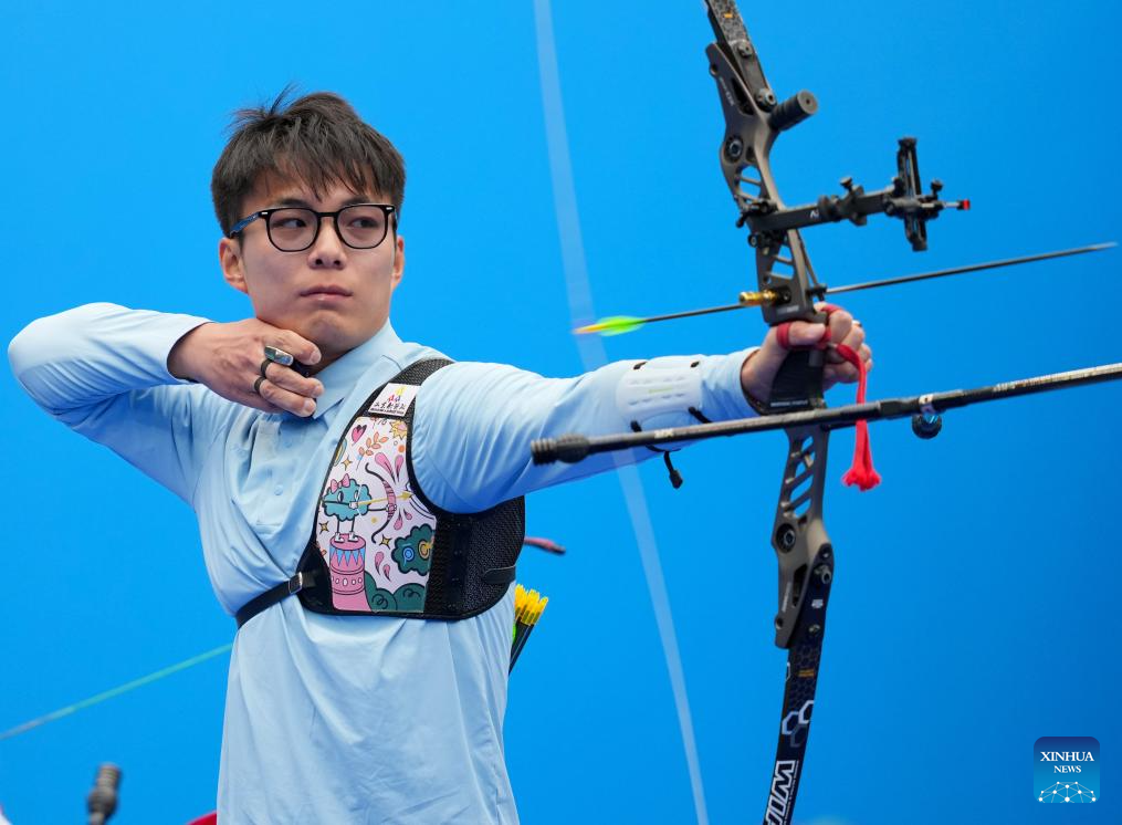 Sun Quan of Shandong competes during the men's recurve team final of archery at China's 15th National Games in Shenzhen, south China's Guangdong Province, Nov. 19, 2025. (Xinhua/Zhang Long)