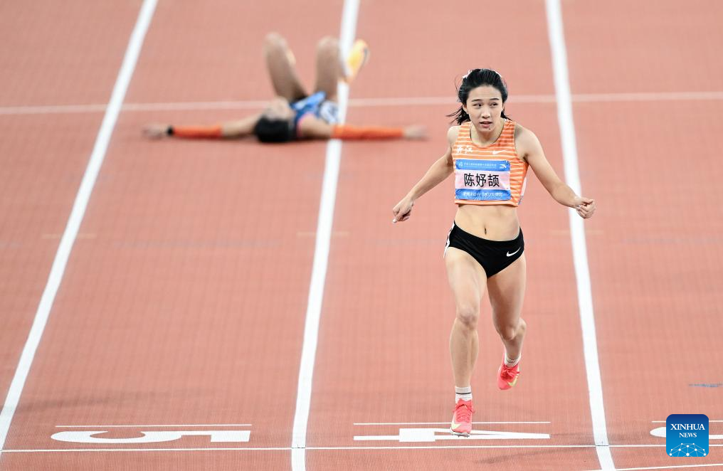 Chen Yujie (R) of Zhejiang crosses the finish line during the women's 200m final of athletics at China's 15th National Games in Guangzhou, south China's Guangdong Province, Nov. 19, 2025. (Xinhua/Deng Hua)