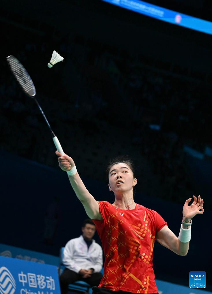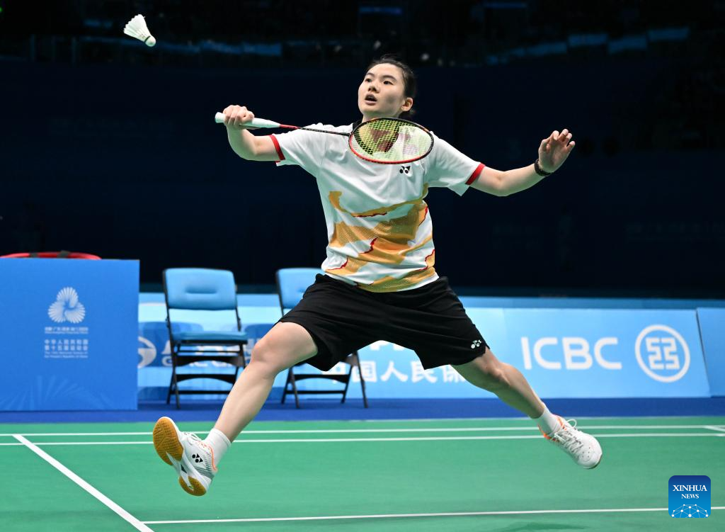 Gao Fangjie hits a return during the women's singles bronze medal match of badminton between Han Yue of Fujian and Gao Fangjie of Jiangsu at China's 15th National Games in Shenzhen, south China's Guangdong Province, Nov. 19, 2025. (Xinhua/Li Ziheng)