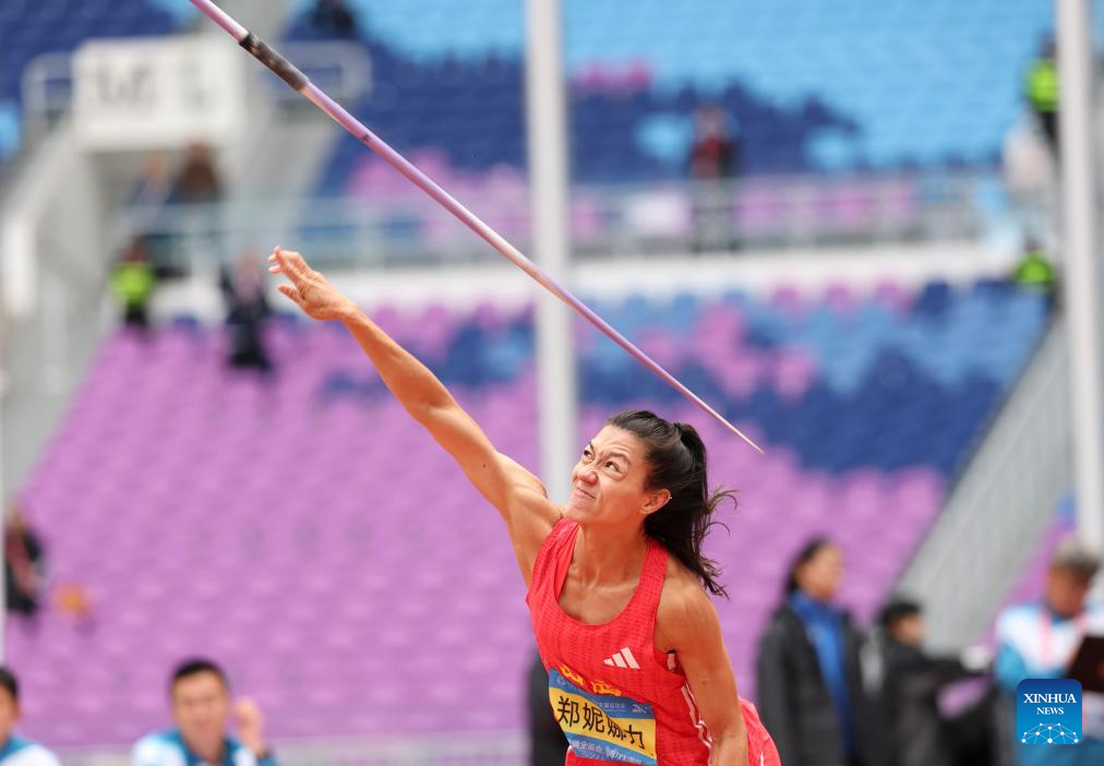 Zheng Ninali of Shanxi competes during the women's heptathlon javelin throw of athletics at China's 15th National Games in Guangzhou, south China's Guangdong Province, Nov. 19, 2025. (Xinhua/Jiang Han)