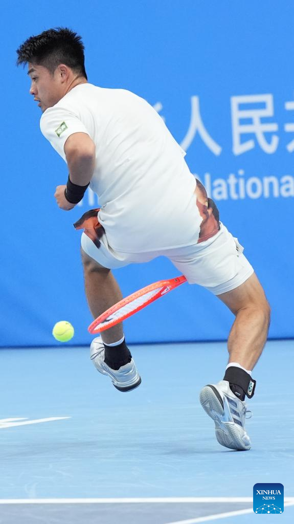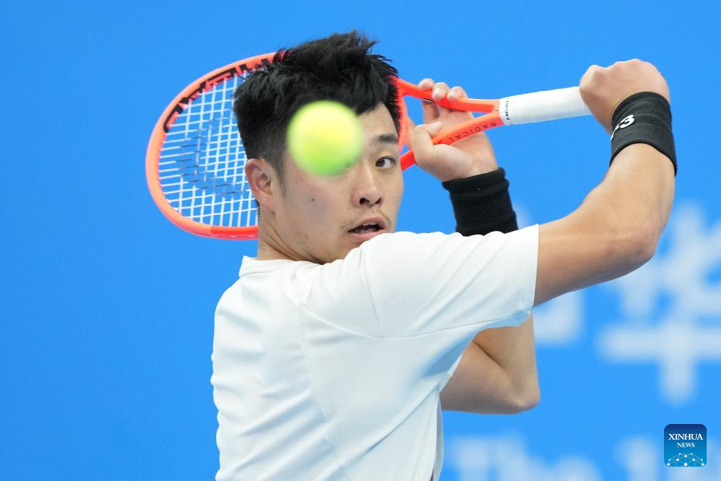 Wu Yibing hits a return during the tennis men's singles final between Shang Juncheng of Beijing and Wu Yibing of Zhejiang at China's 15th National Games in Hengqin, south China's Guangdong Province, Nov. 20, 2025. (Xinhua/Yan Linyun)