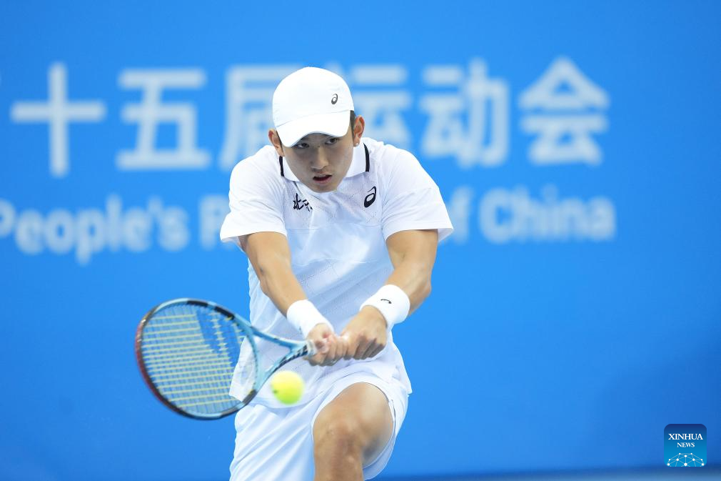 Shang Juncheng hits a return the tennis men's singles final between Shang Juncheng of Beijing and Wu Yibing of Zhejiang at China's 15th National Games in Hengqin, south China's Guangdong Province, Nov. 20, 2025. (Xinhua/Yan Linyun)