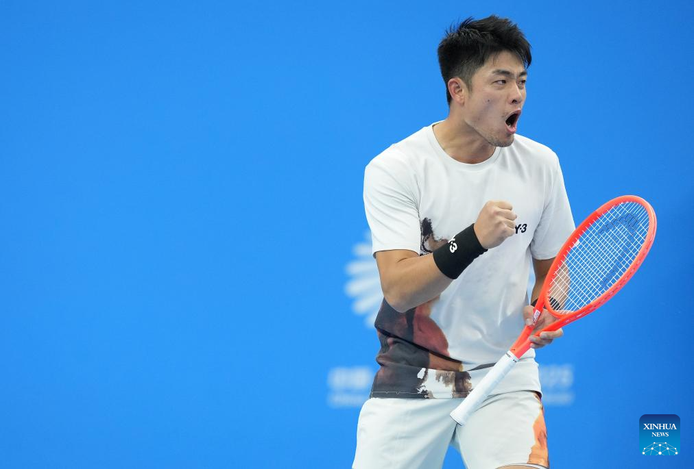Wu Yibing celebrates scoring during the tennis men's singles final between Shang Juncheng of Beijing and Wu Yibing of Zhejiang at China's 15th National Games in Hengqin, south China's Guangdong Province, Nov. 20, 2025. (Xinhua/Yan Linyun)