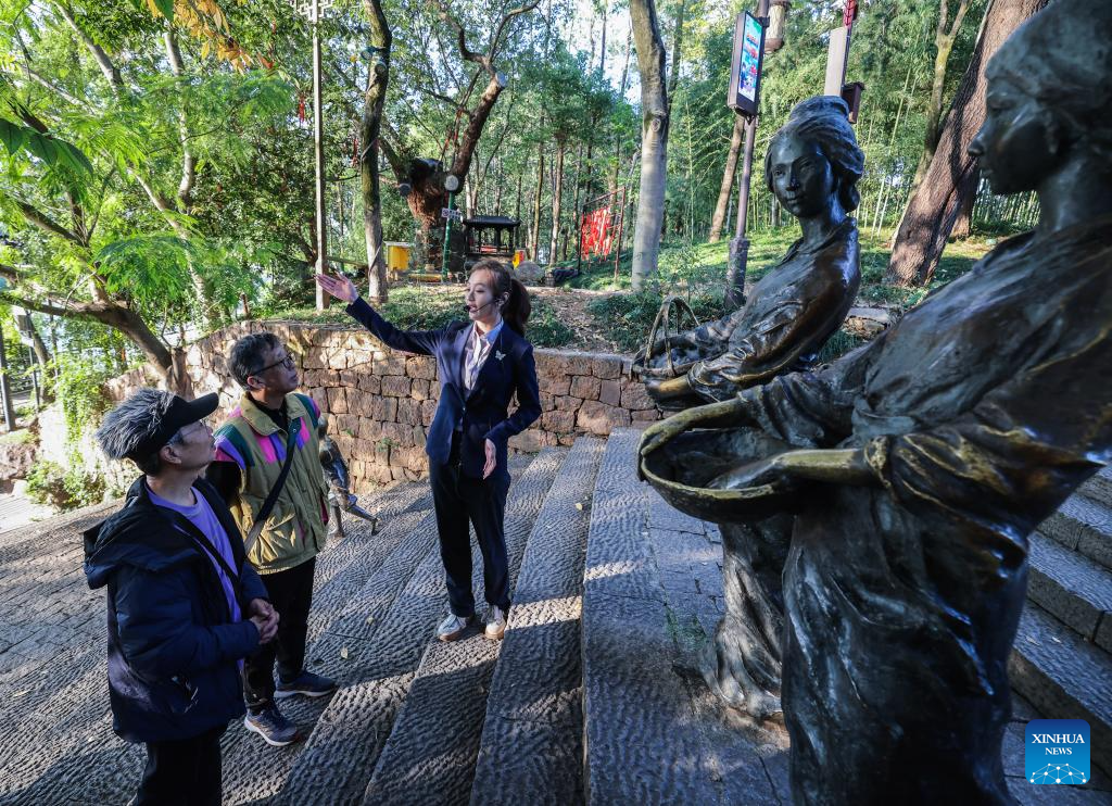 A tour guide (R) introduces related history story to tourists at a scenic spot in Zhuji, east China's Zhejiang Province, Nov. 20, 2025. In recent years, Zhuji has been actively building a high-quality tour guide team, with measures such as skill training and excellent tour guide selection, so as to provide tourists with an in-depth and warm experience and improve local tourism. (Xinhua/Xu Yu)