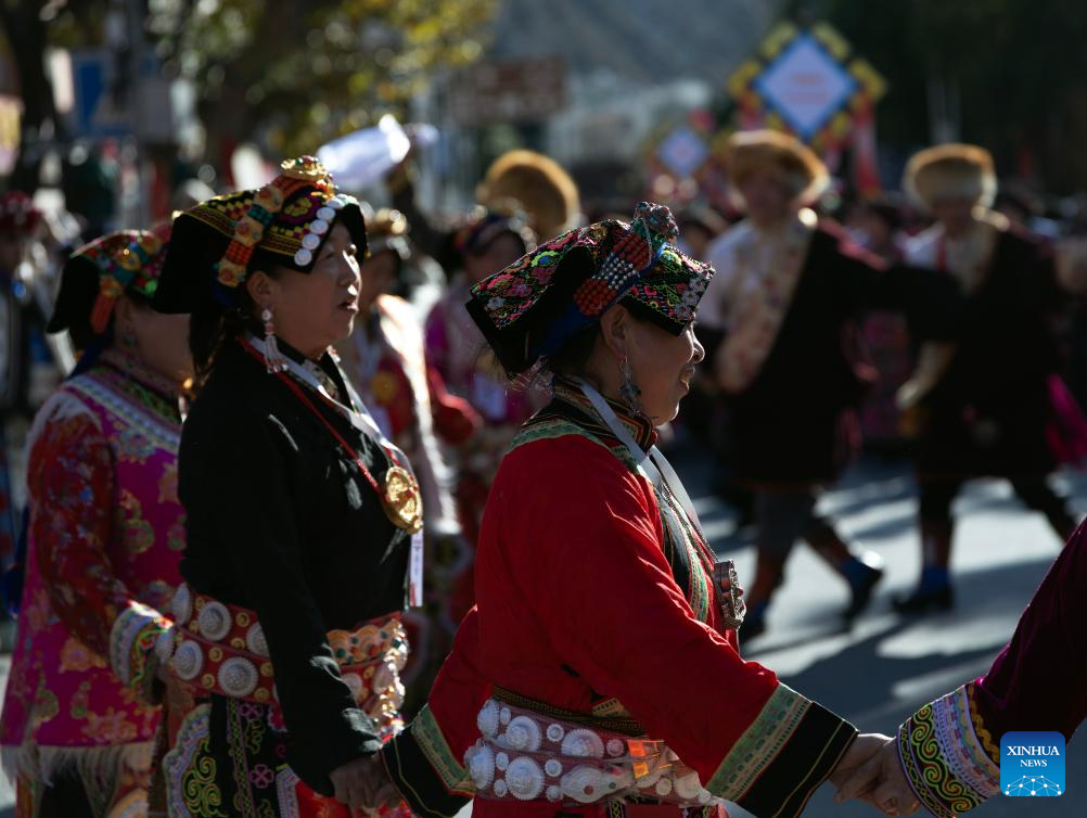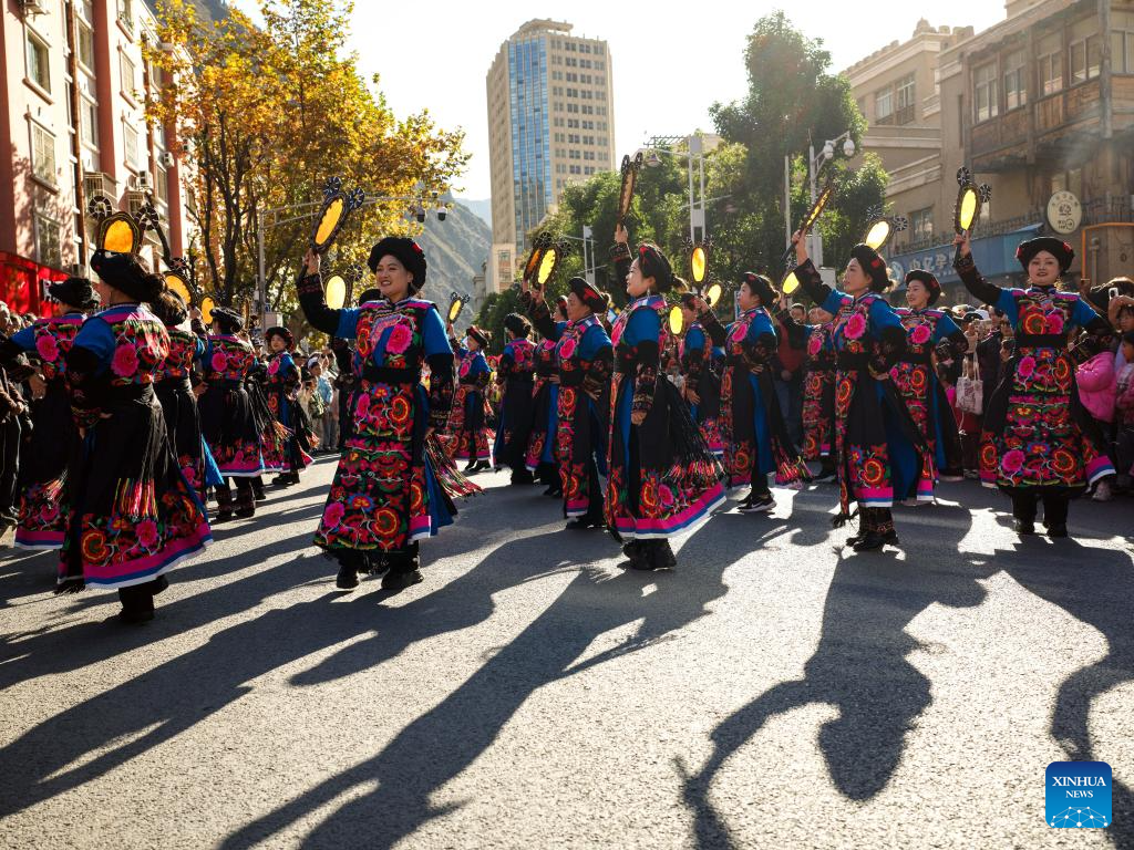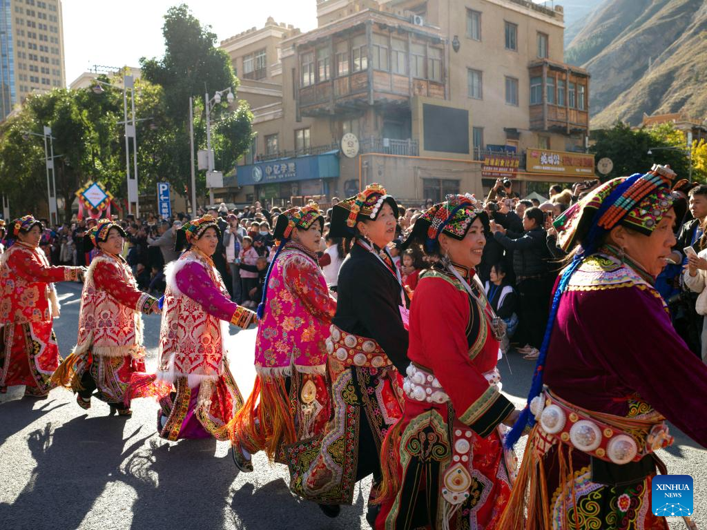 Women in ethnic attire perform during an event celebrating the Qiang New Year in Wenchuan County, Aba Tibetan and Qiang Autonomous Prefecture, southwest China's Sichuan Province, Nov. 19, 2025. An event celebrating the Qiang New Year was held here on Wednesday, starting a series of activities to celebrate the Qiang New Year, which falls on Nov. 20 this year. (Photo by Lan Hongguang/Xinhua)