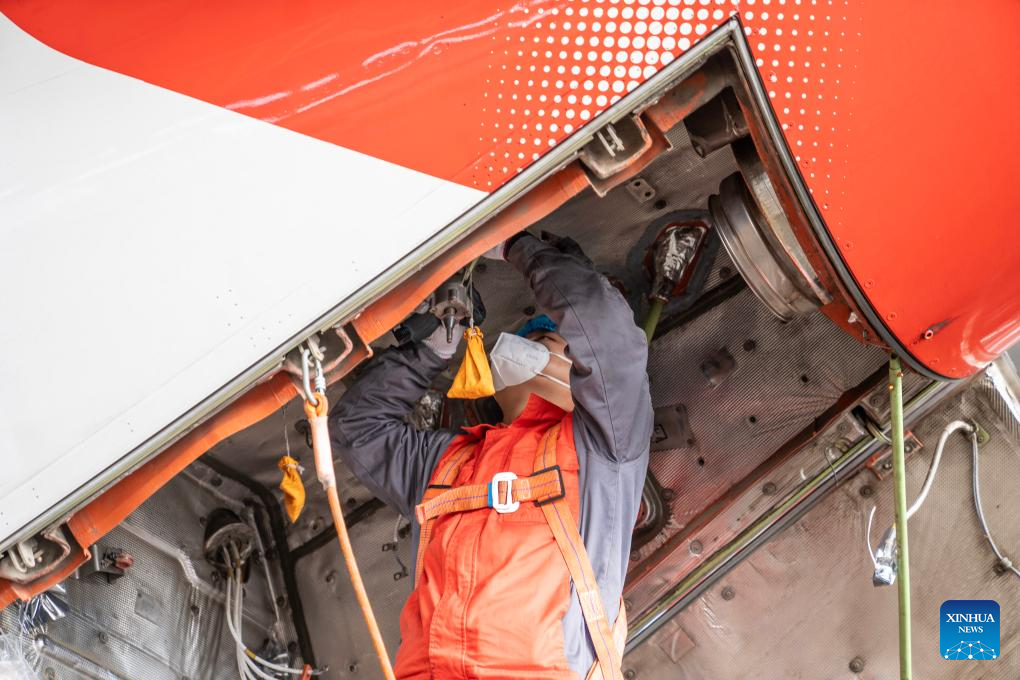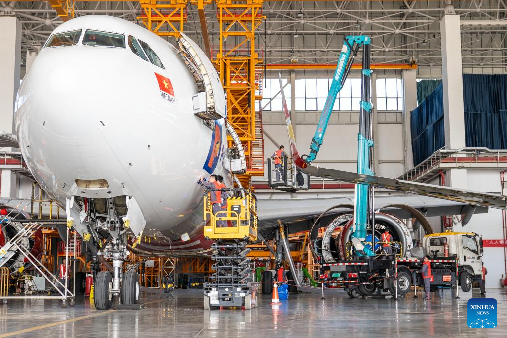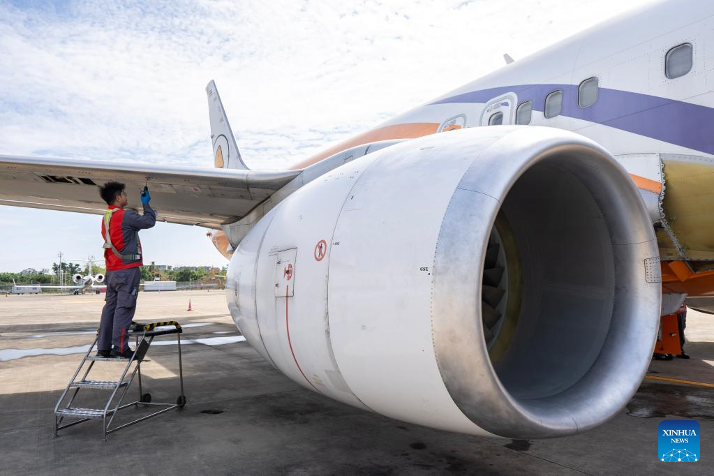 Staff members of the Grand China Aviation Maintenance Co., Ltd. under the HNA Technic perform maintenance on an aircraft at the Hainan Free Trade Port (FTP) One-Stop Aircraft Maintenance Base in Haikou, south China's Hainan Province, on Nov. 21, 2025. (Xinhua/Zhang Liyun)