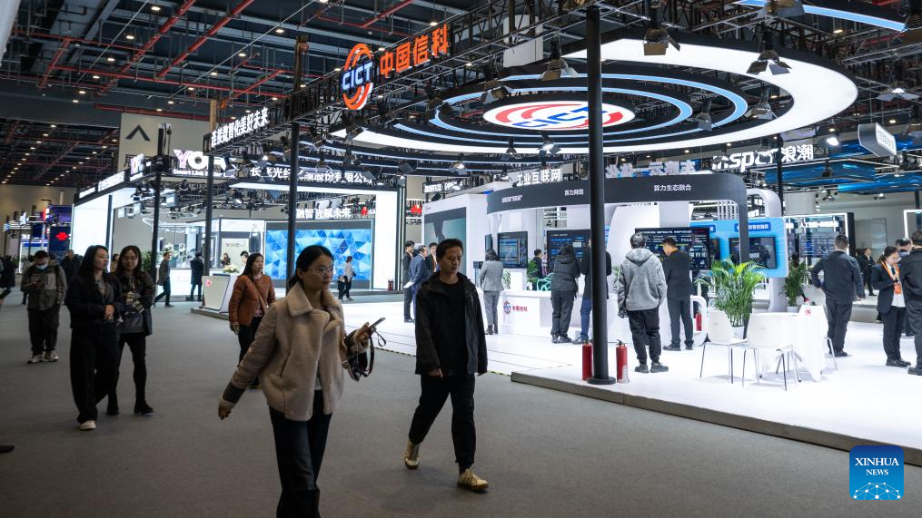 People visit an exhibition hall during the 2025 China 5G + Industrial Internet Conference in Wuhan, central China's Hubei Province, Nov. 21, 2025. The conference kicked off here on Friday and will run through Sunday. (Xinhua/Du Zixuan)