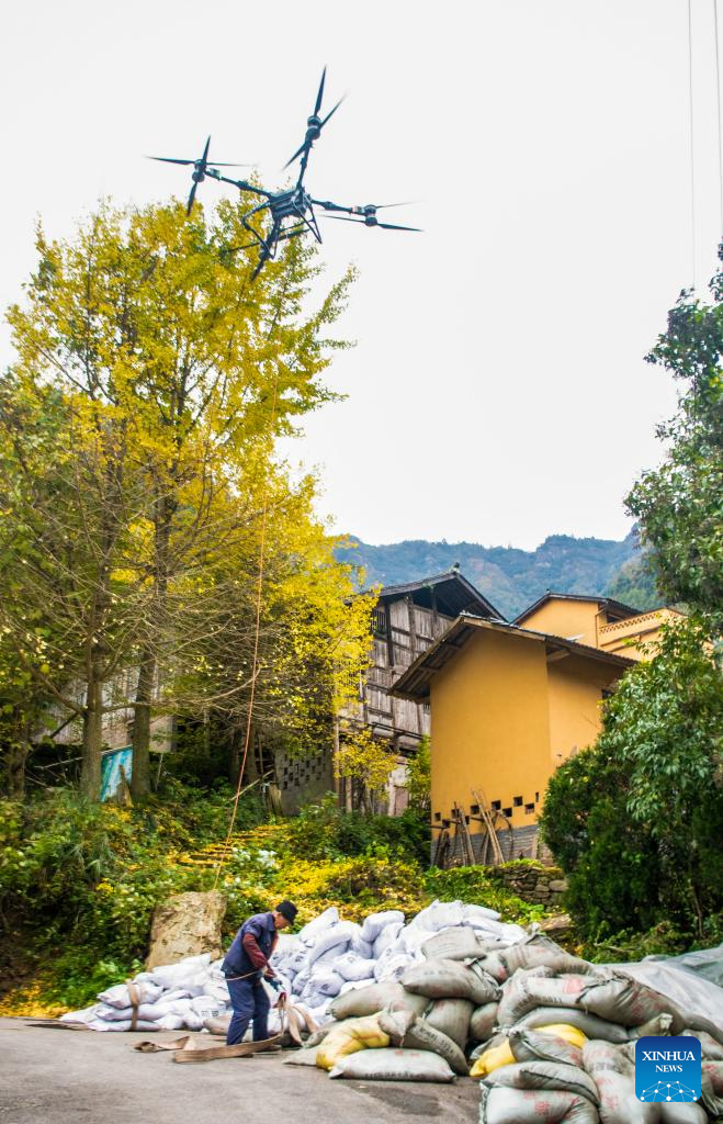 A farmer operates a drone to transport fertilizer to a sealwort field, a kind of traditional Chinese herb, in Zhongyi Township, Shizhu County, southwest China's Chongqing, Nov. 22, 2025. (Xinhua/Tang Yi)