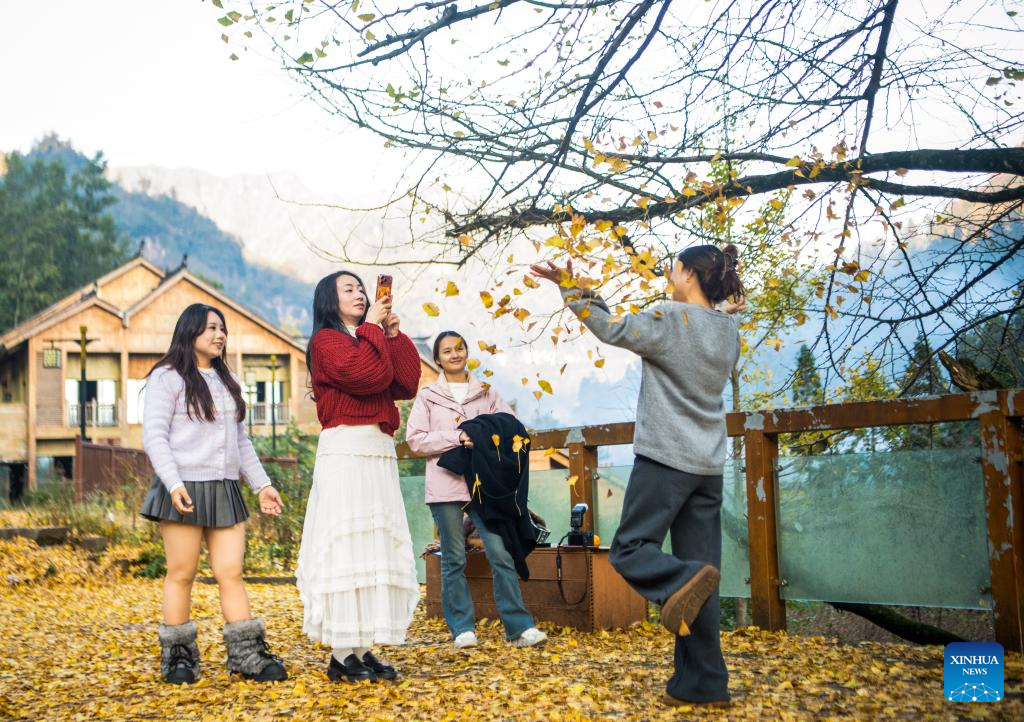 Tourists take photos in Zhongyi Township, Shizhu County, southwest China's Chongqing, Nov. 21, 2025. (Xinhua/Tang Yi)