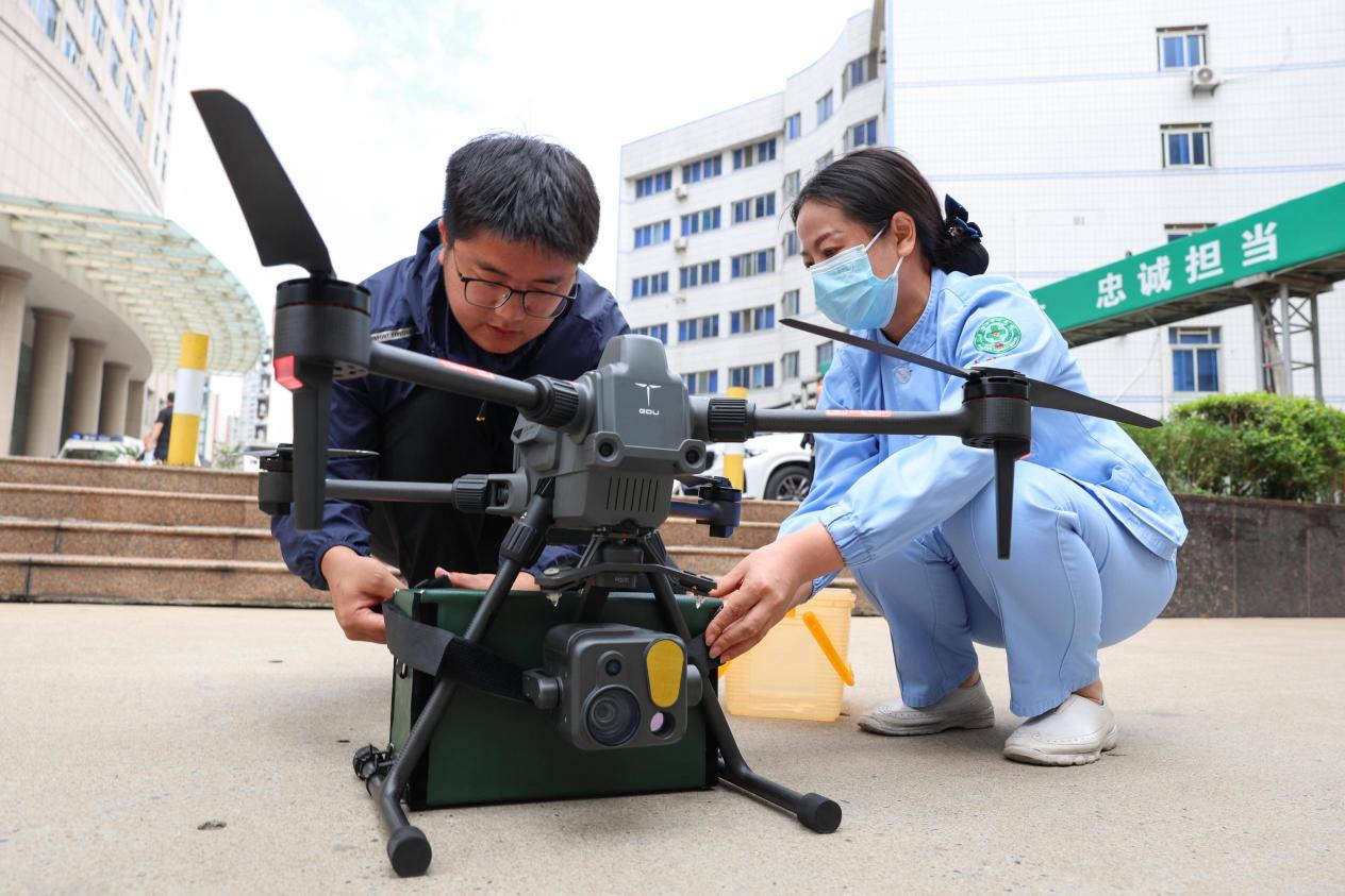 A medical worker of a hospital in Xiangyang, central China's Hubei province loads blood samples onto a drone, June 3, 2025. (Photo/Yang Dong)