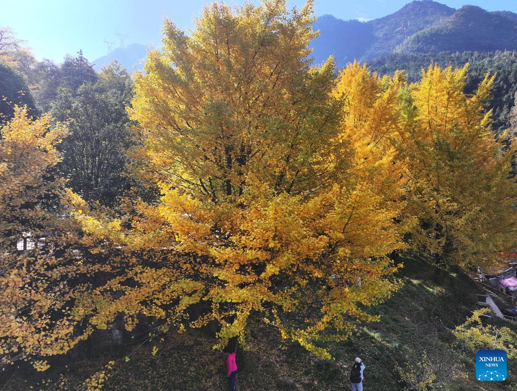 A drone photo taken on Nov. 23, 2025 shows people enjoying their leisure time under ginkgo trees in Tongziao Village, Shuangpai County, Yongzhou City, central China's Hunan Province. More than 3,000 ginkgo trees here have gradually turned golden, attracting a lot of tourists. (Xinhua/Zhao Zhongzhi)