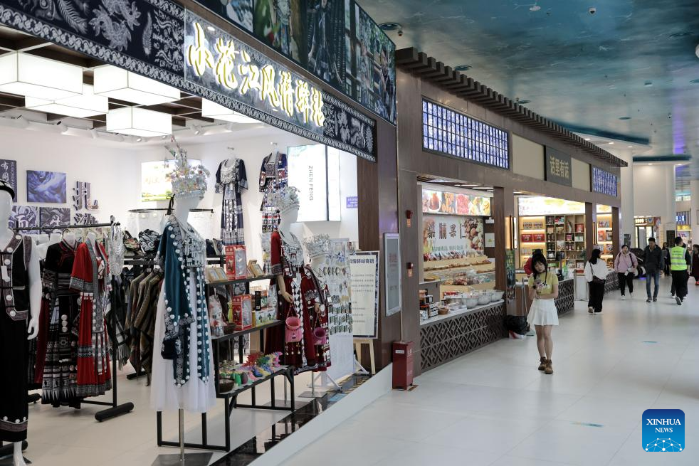 This photo taken on Nov. 6, 2025 shows shops at the Yundu service area of the Huajiang Grand Canyon Bridge in southwest China's Guizhou Province. The Huajiang Grand Canyon Bridge, soaring 625 meters above the Beipan River in Guizhou's mountainous terrain, is the world's highest bridge. The nearby Yundu service area features a comprehensive complex that integrates bridge viewing, sports experiences and other tourism services. (Xinhua/Ou Dongqu)