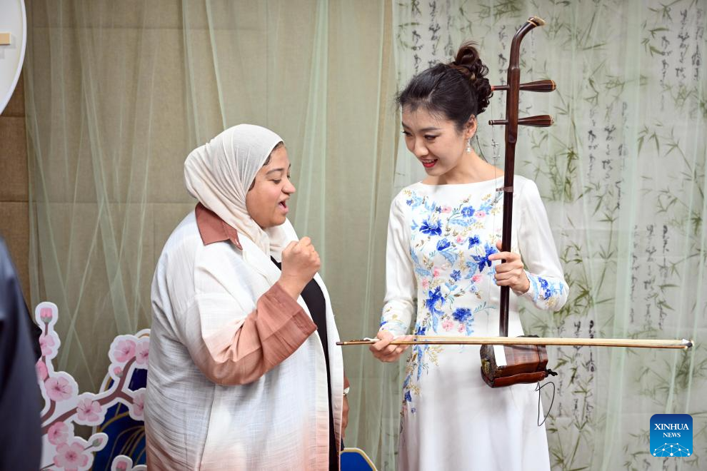 A visitor interacts with a Chinese musician at the China Cultural Center in Hawalli Province, Kuwait, on Nov. 24, 2025. The China Cultural Center in Kuwait hosted a Chamber Concert of Chinese Classical Music event under the theme "Traditional Rhythm & New Vibe" as part of its Chinese Culture Series -- Night of Chinese Language. (Photo by Asad/Xinhua)