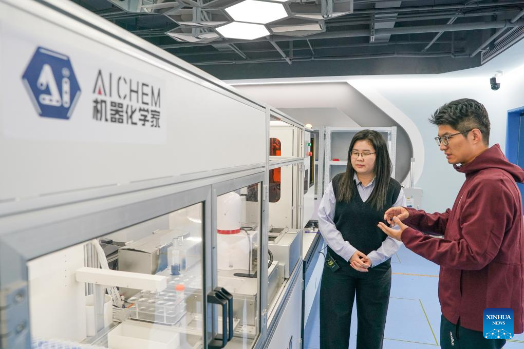 Professor Zhu Zhuoying (L) and doctoral student Chen Bingxu have a discussion at the state key laboratory of precision and intelligent chemistry of the University of Science and Technology of China (USTC) in Hefei, east China's Anhui Province, Nov. 24, 2025. Traditional chemical research has long relied on continuous trial and error by scientists. With the development of artificial intelligence and robotic automation technologies, it has become possible to design experiments and issue instructions through intelligent platforms, using robots to replace human labor in experiential operations, which enhances experimental efficiency and precision.