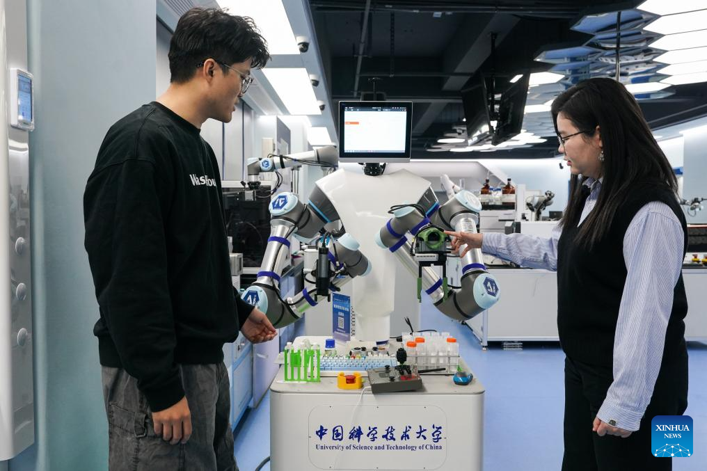 Professor Zhu Zhuoying (R) and doctoral student Guo Lulu have a discussion in front of Robot Xiaolin at the state key laboratory of precision and intelligent chemistry of the University of Science and Technology of China (USTC) in Hefei, east China's Anhui Province, Nov. 24, 2025. Traditional chemical research has long relied on continuous trial and error by scientists. With the development of artificial intelligence and robotic automation technologies, it has become possible to design experiments and issue instructions through intelligent platforms, using robots to replace human labor in experiential operations, which enhances experimental efficiency and precision.