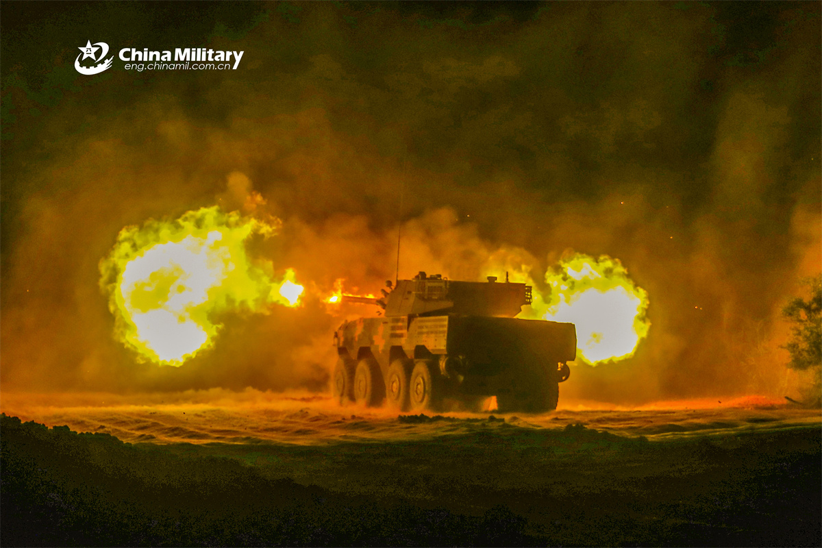 An armored vehicle attached to a brigade under the Chinese PLA Army spits fire at night during a live-fire training exercise on November 2, 2025. (eng.chinamil.com.cn/Photo by Zhang Mao)
