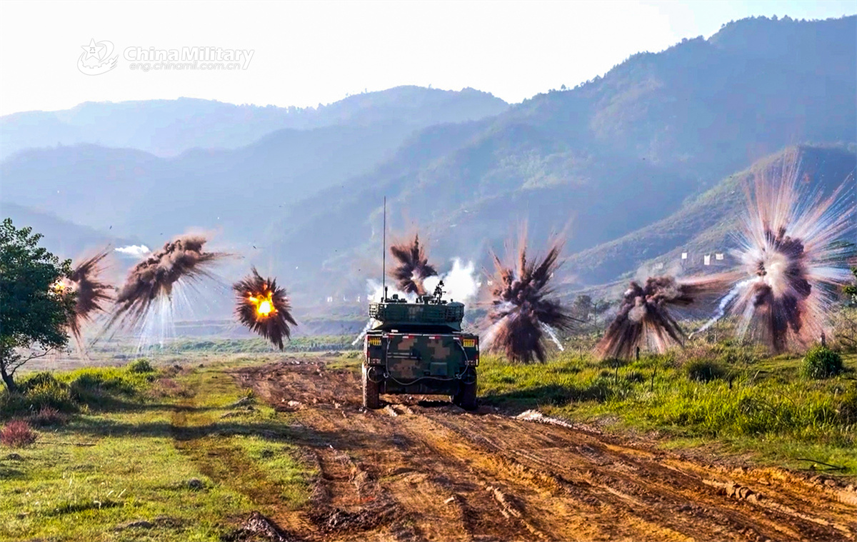 An armored vehicle attached to a brigade under the Chinese PLA Army fires smoke bombs during a live-fire training exercise on November 2, 2025. (eng.chinamil.com.cn/Photo by Zhang Mao)