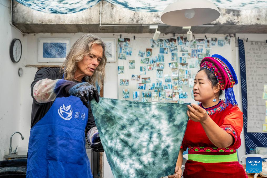 Brian Linden (L), an American from Chicago who has lived in Dali for over a decade, checks his tie-dye product at Dali Blue workshop in Xizhou old town of Dali Bai Autonomous Prefecture, southwest China's Yunnan Province, Nov. 24, 2025. (Xinhua/Hu Chao)