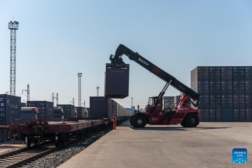 Workers conduct container hoisting operations at the Vientiane South Station on the China-Laos Railway in Vientiane, capital of Laos, Nov. 29, 2025. (Photo by Kaikeo Saiyasane/Xinhua)