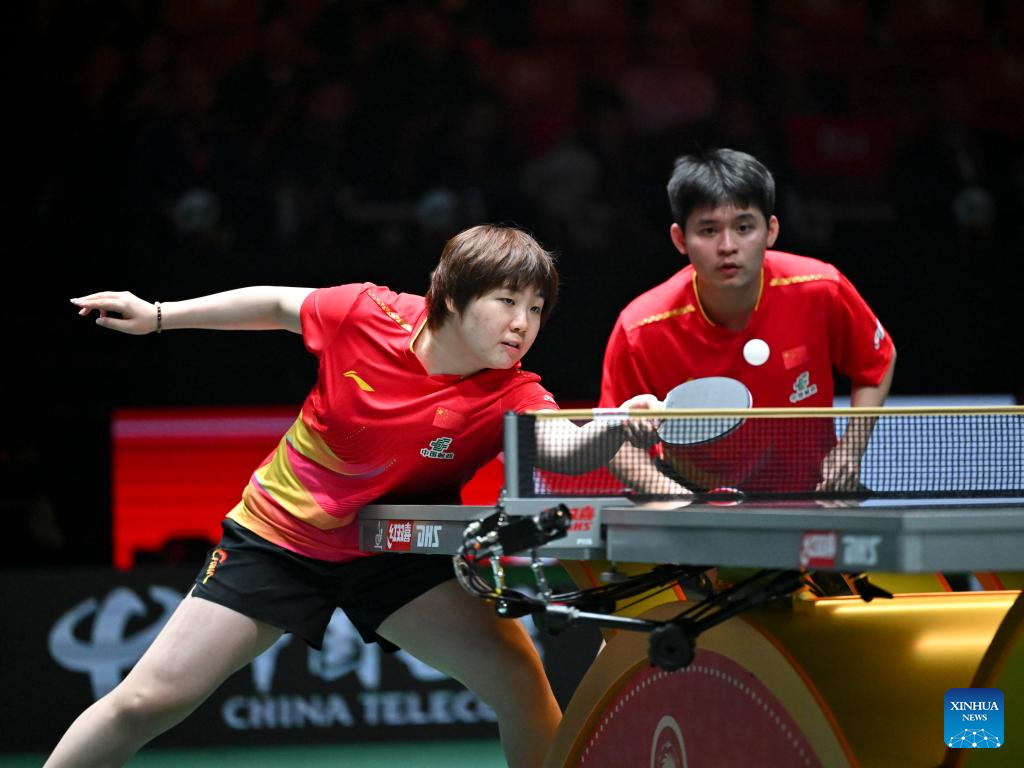 Lin Shidong/Kuai Man (L) of China compete in the mixed doubles match against Badr Mostafa/Marwa Alhodaby of Egypt during the stage 1 group match between China and Egypt at the ITTF Mixed Team World Cup 2025 in Chengdu, southwest China's Sichuan Province, Dec. 1, 2025. (Xinhua/Xu Bingjie)