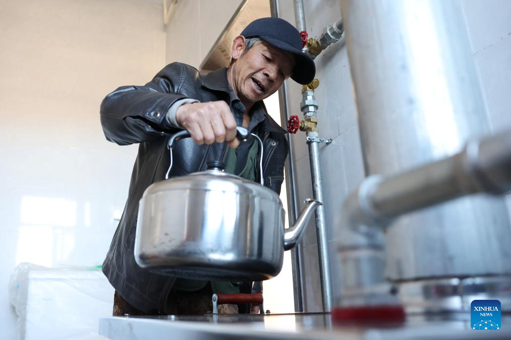Villager Wang Jianwu boils water at his new home at a resettlement site for flood affected households in Jiuzhuanggou Village of Mapo Town in Yuzhong County, northwest China's Gansu Province, Dec. 1, 2025. Yuzhong County, which is under the jurisdiction of the provincial capital Lanzhou, was hit by mountain torrents triggered by torrential rains this August. According to a reconstruction plan made by the local government, six resettlement sites for 325 families are on construction smoothly.