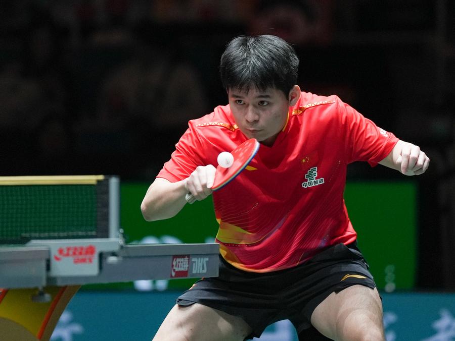 Lin Shidong of China hits a return during the men's singles match against Tomislav Pucar of Croatia during the stage 2 match at the ITTF Mixed Team World Cup 2025 in Chengdu, southwest China's Sichuan Province, Dec. 3, 2025. (Xinhua/Wang Xi)