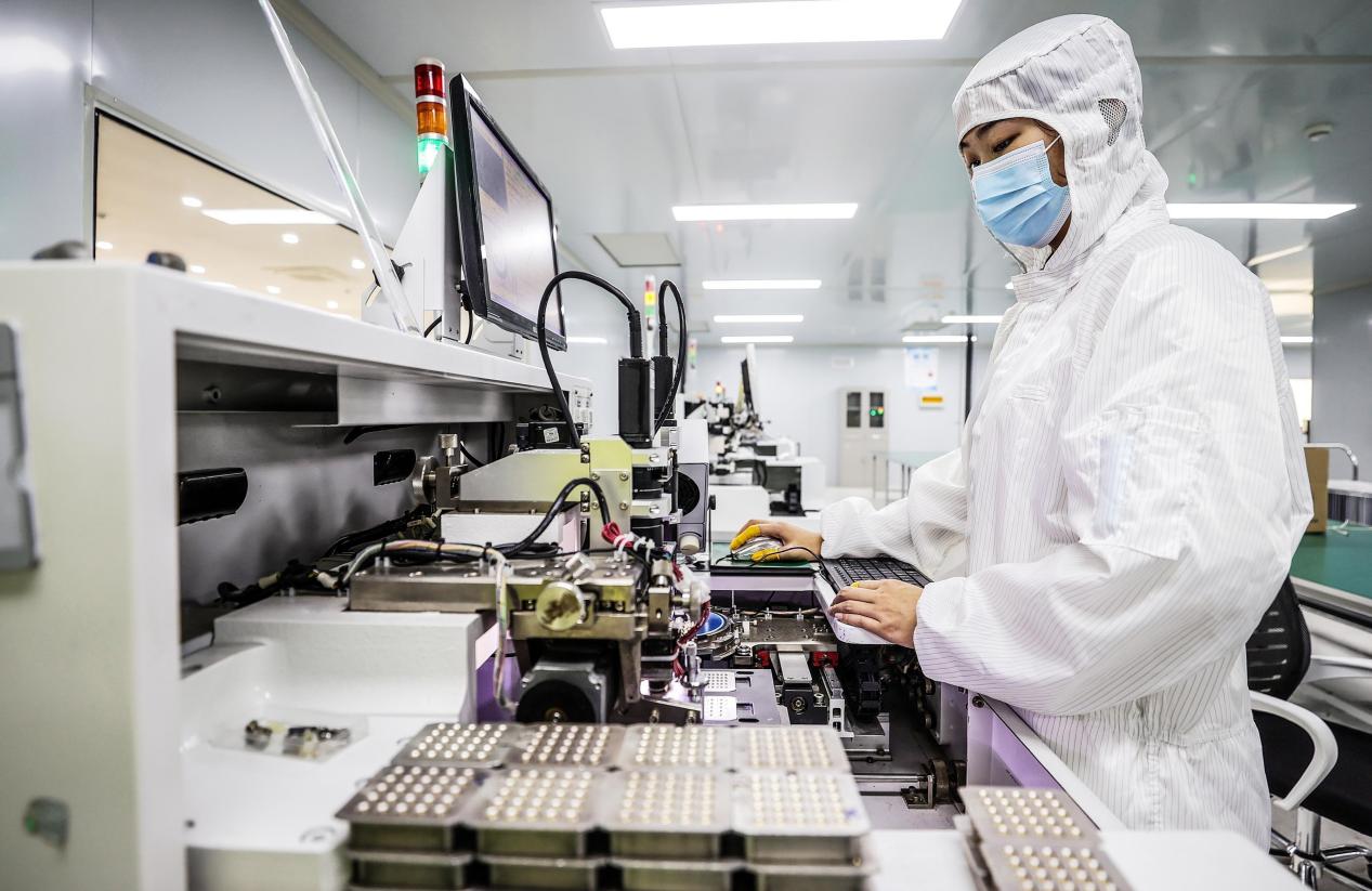A worker manufactures 5G optical communication components in a workshop of a company in Huaibei, east China's Anhui province. (Photo/Feng Shufeng)