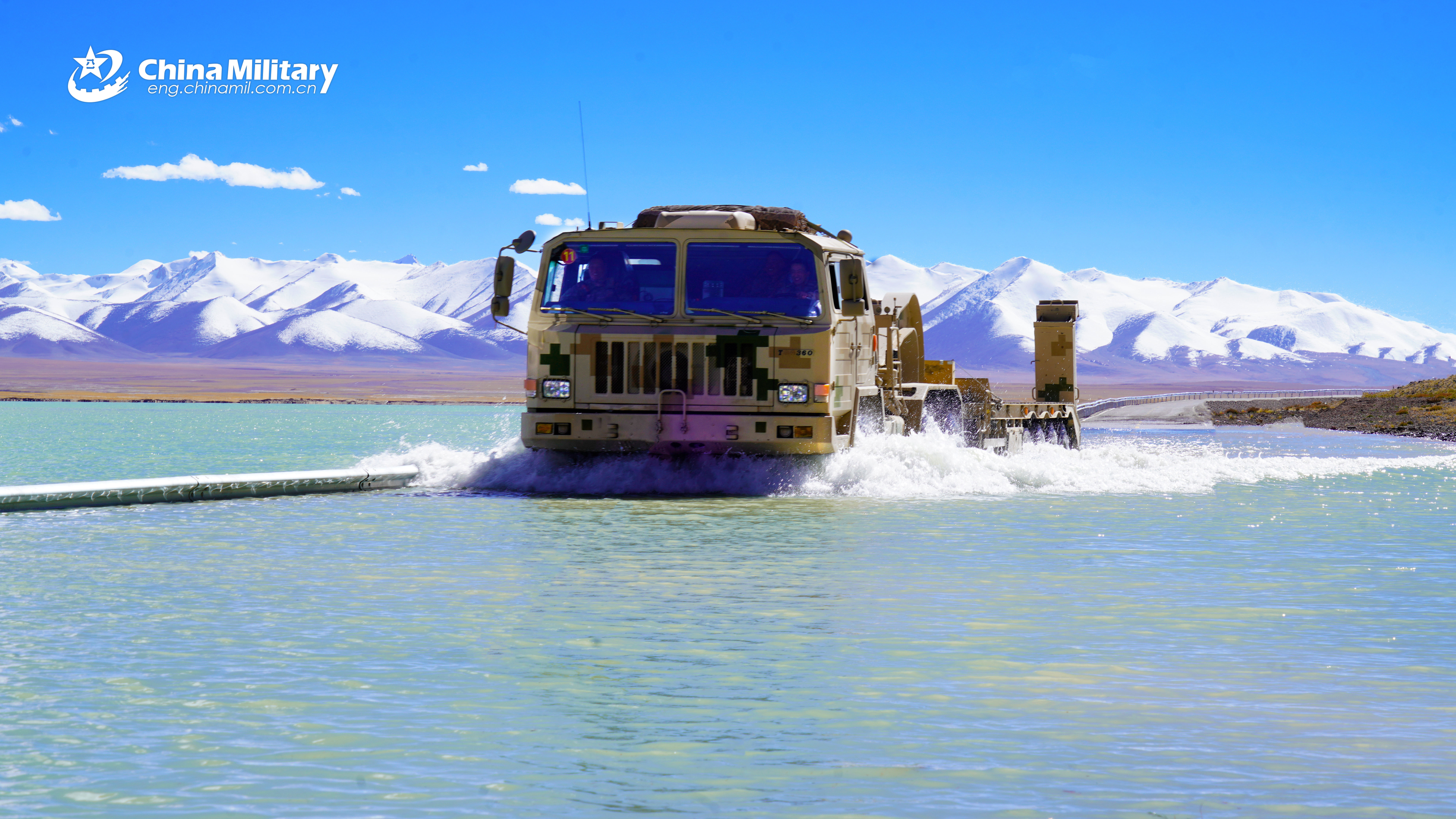 TA4360 heavy equipment transport vehicle attached to the Chinese PLA Xinjiang Military Command wades through water area during a maneuver training exercise on November 7, 2025. (eng.chinamil.com.cn/Photo by Zhou Zilong)