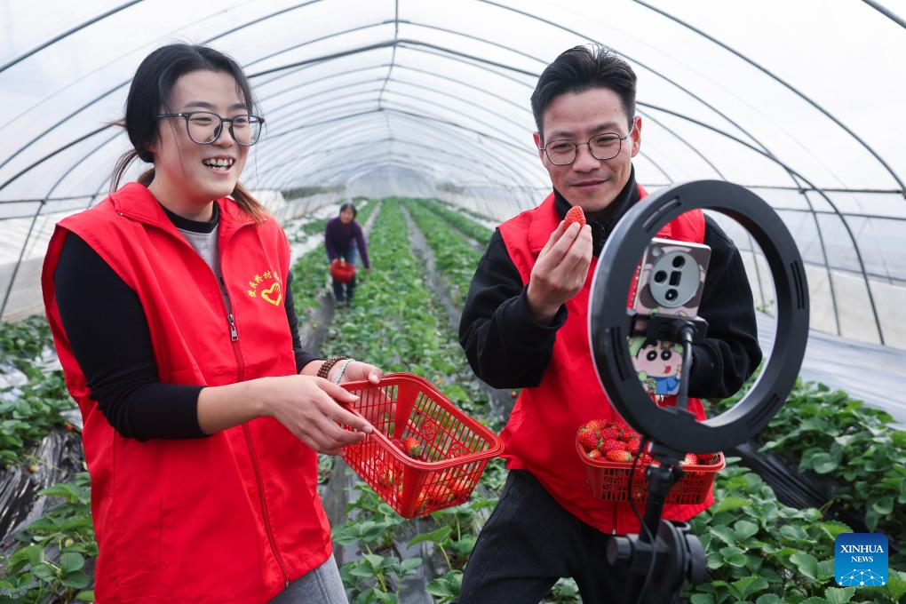 Volunteers promote local agricultural products via live-streaming at a farm in Bianminqiao Village of Heping Town in Changxing County of Huzhou City, east China's Zhejiang Province, Dec. 4, 2025. In recent years, Heping Town has been promoting the modernization, standardization, professionalization and digitalization of its agricultural industry to effectively improve the quality of local agricultural products. What's more, relying on its modern agricultural resources, Heping Town also strives to develop its rural tourism industry through various activities like fruits leisure picking and vegetable and fruits study and research tours. (Xinhua/Xu Yu)