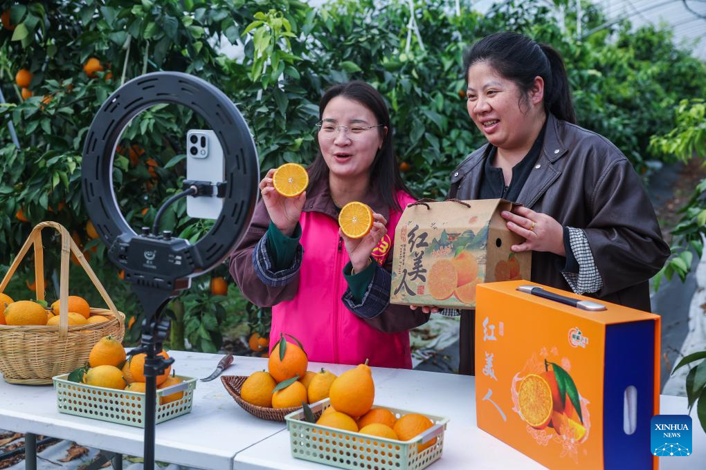 A volunteer (L) and a fruit grower promote local citruses via live-streaming at an orchard in Dongshan Village of Heping Town in Changxing County of Huzhou City, east China's Zhejiang Province, Dec. 4, 2025. In recent years, Heping Town has been promoting the modernization, standardization, professionalization and digitalization of its agricultural industry to effectively improve the quality of local agricultural products. What's more, relying on its modern agricultural resources, Heping Town also strives to develop its rural tourism industry through various activities like fruits leisure picking and vegetable and fruits study and research tours. (Xinhua/Xu Yu)