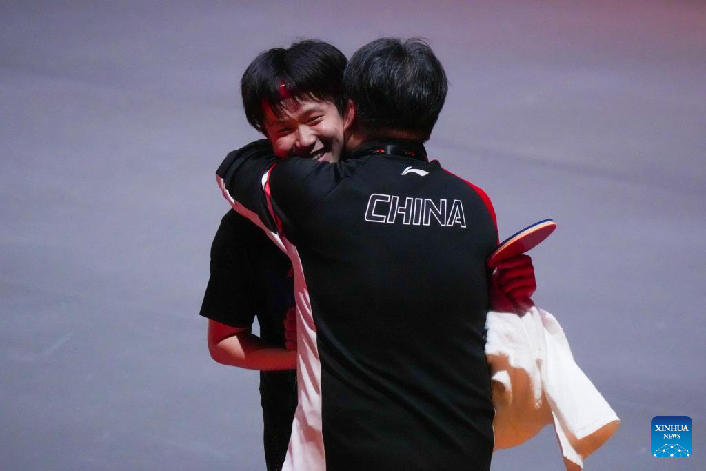 Wang Chuqin (L) celebrates with his coach after winning the men's singles round of 16 match between Wang Chuqin of China and Matsushima Sora of Japan at the WTT Finals Hong Kong 2025 in Hong Kong, south China, Dec. 10, 2025. (Xinhua/Zhu Wei)