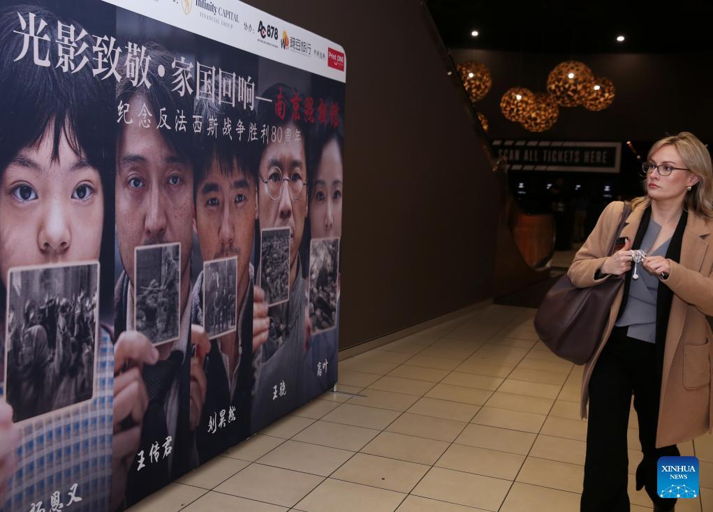 A woman looks at a promotional display for the film "Dead to Rights" at a cinema in Sydney, Australia, Aug. 8, 2025. The film, which depicts the Nanjing Massacre during World War II, was released in Australia on Aug. 7. (Xinhua/Ma Ping)