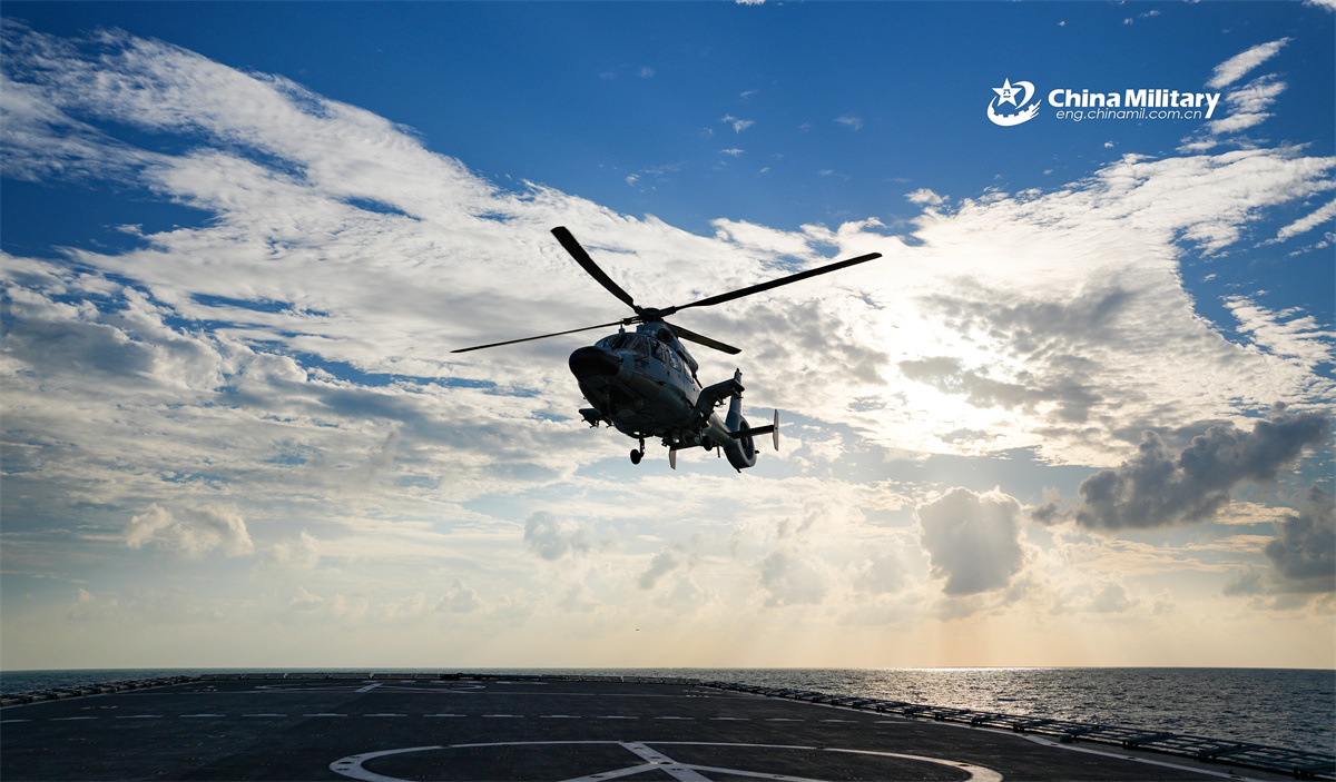 A ship-borne helicopter takes off from the deck of the Type 071 amphibious dock landing ship Longhushan (Hull 980) attached to a landing ship flotilla under the Chinese PLA Navy during a maritime training exercise in mid-November, 2025. (eng.chinamil.com.cn/Photo by Zhai Tao)