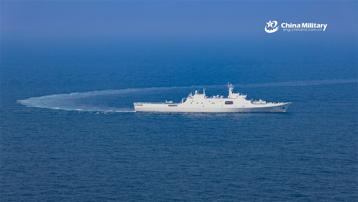 The Type 071 amphibious dock landing ship Longhushan (Hull 980) attached to a landing ship flotilla under the Chinese PLA Navy maneuvers at sea during a maritime training exercise in mid-November, 2025. (eng.chinamil.com.cn/Photo by Zhai Tao)