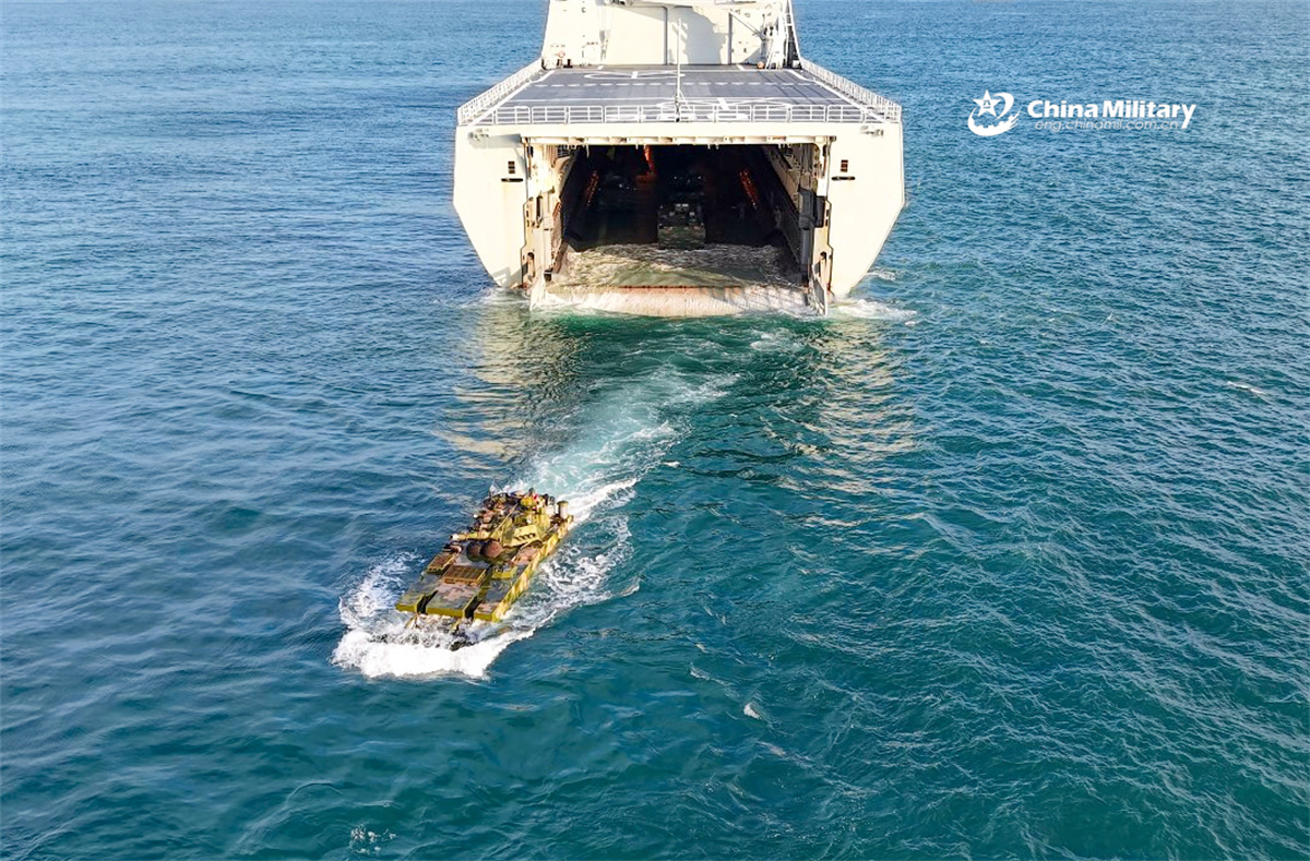An amphibious vehicle leaves the well deck of the Type 071 amphibious dock landing ship Longhushan (Hull 980) attached to a landing ship flotilla under the Chinese PLA Navy during a maritime training exercise in mid-November, 2025. (eng.chinamil.com.cn/Photo by Zhai Tao)
