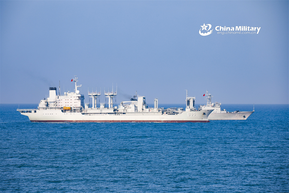 Comprehensive supply ships Qinghaihu (Hull 885) and Luomahu (Hull 907) attached to a flotilla under the Chinese PLA Navy maintain a close-abreast formation during a maritime training exercise in late November, 2025. (eng.chinamil.com.cn/Photo by Li Junlin)