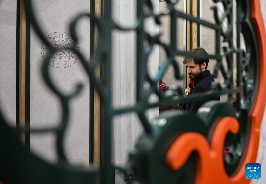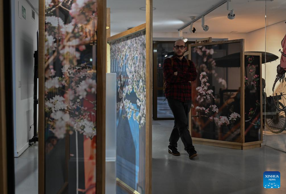 A visitor views exhibits during an exhibition titled "Anshan Cuijin - an Exhibition of Chinese Life Aesthetics" at the China Cultural Center in Madrid, Spain, Dec. 16, 2025. The exhibition kicked off here on Tuesday and will run until March 2026, presenting the elegant charm of Chinese aesthetics. (Xinhua/Cheng Min)