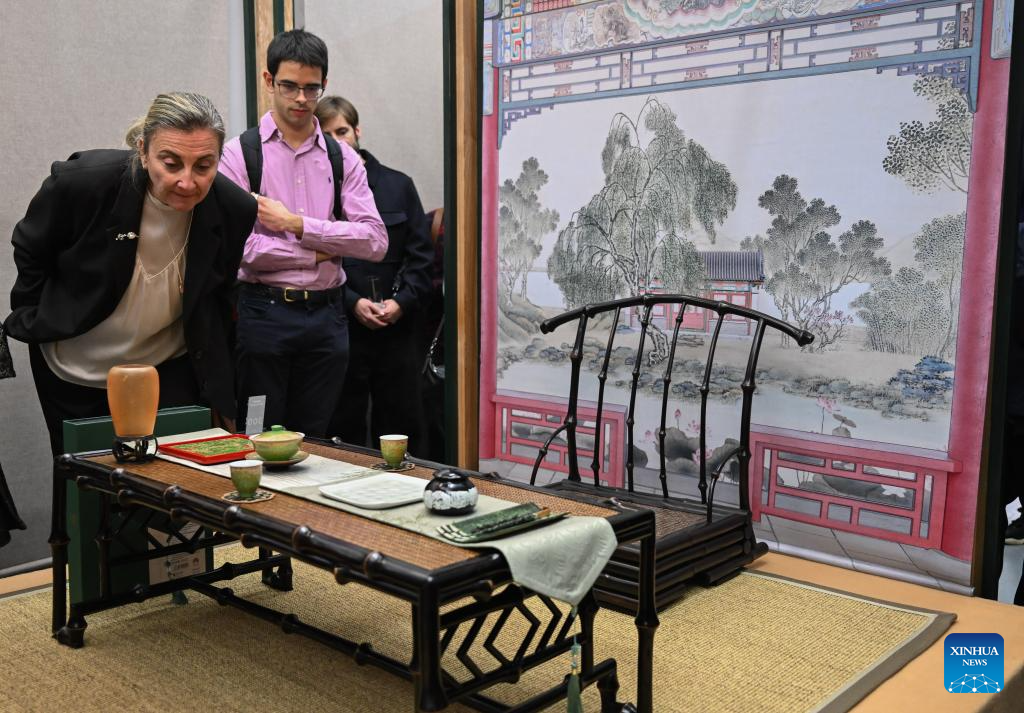 Visitors listen to an introduction on exhibits during an exhibition titled "Anshan Cuijin - an Exhibition of Chinese Life Aesthetics" at the China Cultural Center in Madrid, Spain, Dec. 16, 2025. The exhibition kicked off here on Tuesday and will run until March 2026, presenting the elegant charm of Chinese aesthetics. (Xinhua/Cheng Min)