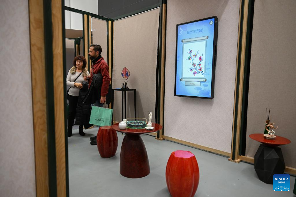 Visitors view exhibits during an exhibition titled "Anshan Cuijin - an Exhibition of Chinese Life Aesthetics" at the China Cultural Center in Madrid, Spain, Dec. 16, 2025. The exhibition kicked off here on Tuesday and will run until March 2026, presenting the elegant charm of Chinese aesthetics. (Xinhua/Cheng Min)