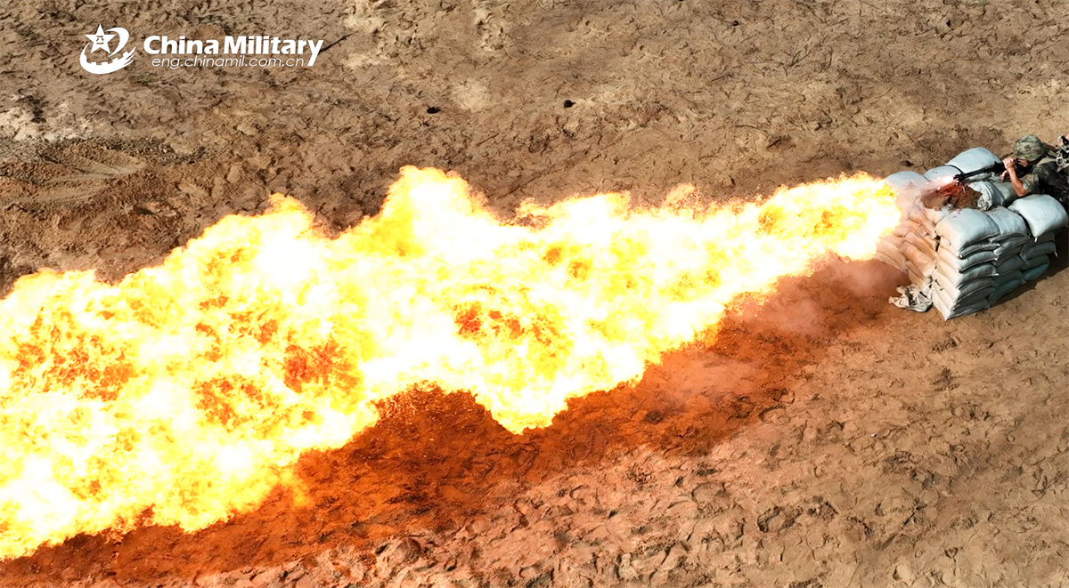 A flamethrower operator assigned to a chemical defense detachment of a brigade under the Chinese PLA Army ignites the controlled fire with a flamethrower against a fire-proof wall on December 6, 2025. (eng.chinamil.com.cn/Photo by Huang Weibo)